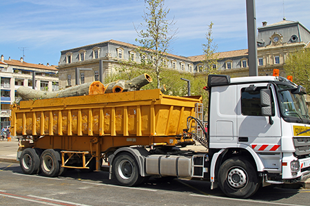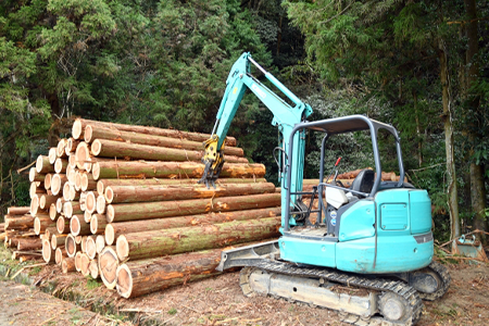 伐採(収穫)した丸太は、ケーブルなどで吊るして山から林道まで運び出されたり、ウインチで引っ張ったりして搬出されます。積みおろし機などで集めてトラックに積み込まれ、原木市場や貯木場へ運ばれます。原木市場や貯木場へ運ばれた木材は競りで製材業者に買われます。また、直接製材工場に運搬される場合もあります。