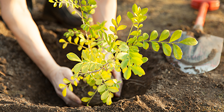 植栽の時期はあまり暑くない春や秋が多く、苗木は山の斜面に手作業で1本ずつ植えていきます。苗木はある程度密集させた方が生存競争がおこるため、早くまっすぐ上に向かって伸びます。スギの場合は、1ha(100m×100m)あたり3000本程度を植えます。
